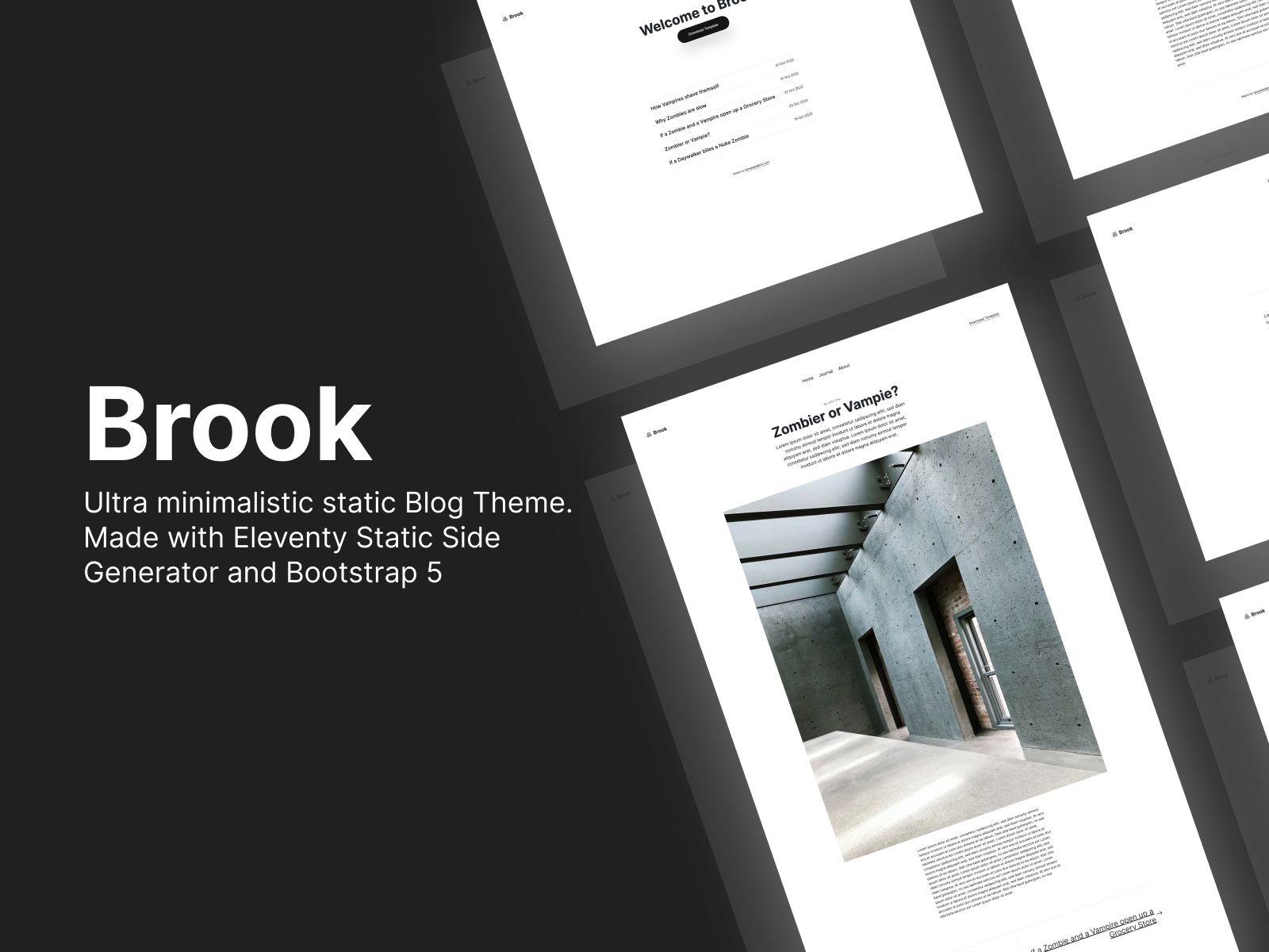 Brook is a free and opensource HTML Blogging template. It is made with Bootstrap 5 and Elventy. A ultra fast static side generator.Check out the live demo here: https://templatedeck.com/